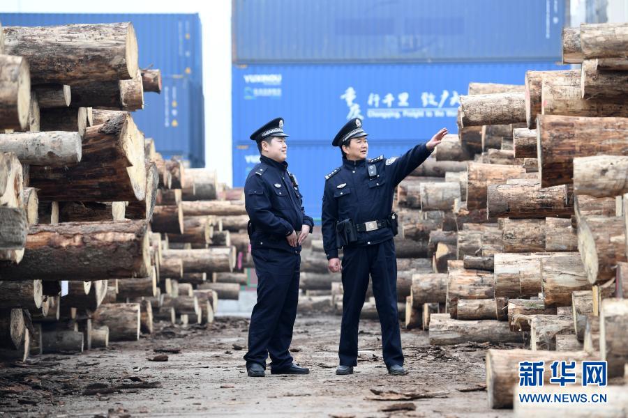 2月8日,民警雷激(右)和同事在重庆团结村中心站货场对存放货物进行巡查。新华社记者 唐奕 摄