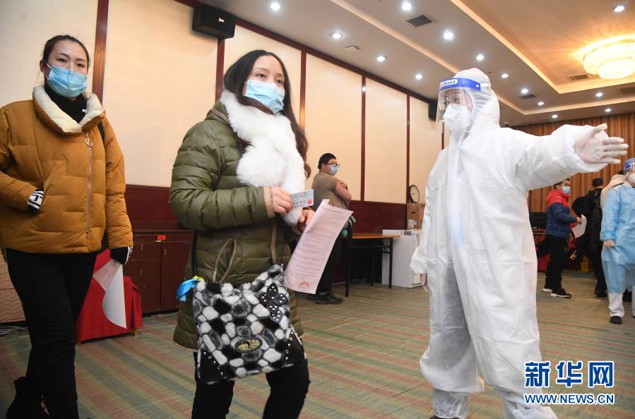 在北京市海淀区北太平庄街道临时新冠疫苗接种点,杨紫缨(右一)引导接种人员接种新冠疫苗(1月31日摄)。新华社记者 任超 摄