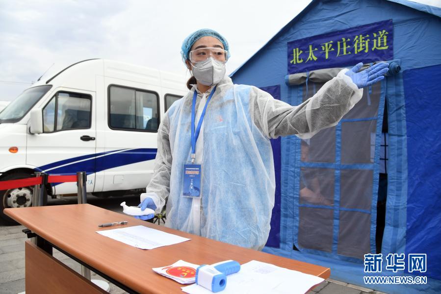 在海淀区集中分流点,杨紫缨引导离鄂返京人员乘车(2020年4月25日摄)。新华社记者 任超 摄