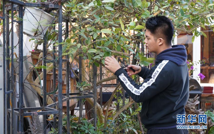 陈纬在私厨的院内为柠檬树修剪枝叶(1月29日摄)。新华社记者 褚萌萌 摄