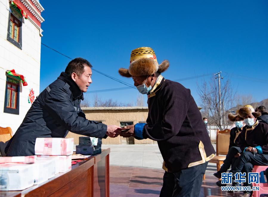 2月9日,西藏自治区供销合作社社有企业——西藏领峰田舍益家公司负责人赵全(左一)给当地群众发放分红。新华社记者 普布扎西 摄