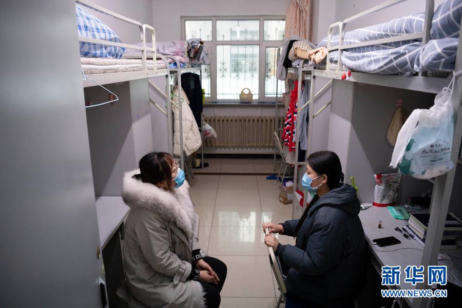 王舒婷(左)在学生公寓楼内与一名留校学生交谈(2月1日摄)。新华社记者 谢剑飞 摄