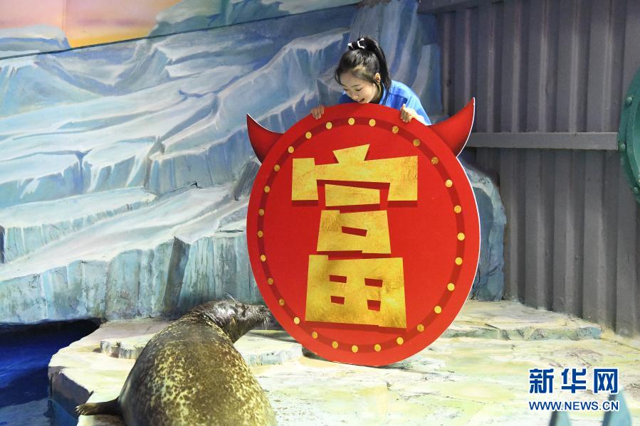 在哈尔滨极地馆,驯养师蒋蕊和海豹互动(2月8日摄)。新华社发