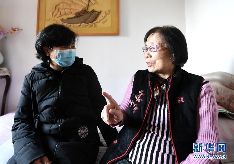 2月9日,社区网格员(左)在独居老人翁淑琴家进行入户探访。新华社记者 赵子硕 摄