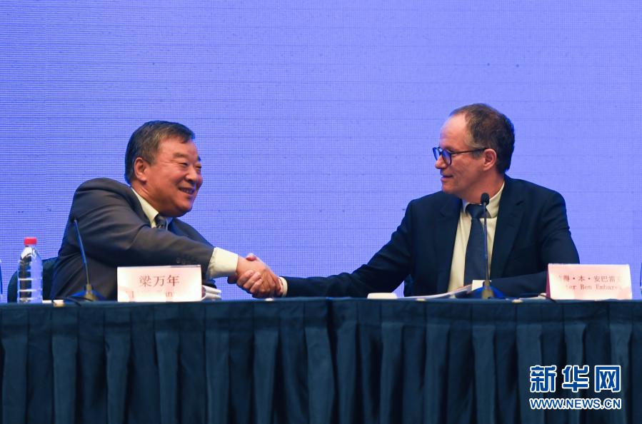 2月9日,联合专家组中方组长梁万年(左)和联合专家组外方组长彼得·本·安巴雷克握手。