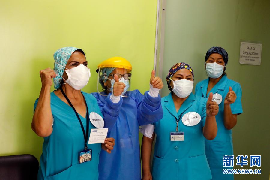 2月9日,在秘鲁首都利马圣巴托洛梅国立医院,一线医护人员庆祝接种新冠疫苗。新华社发(玛利亚娜·巴索摄)