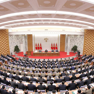 这张朝中社2月10日提供的图片显示的是9日举行的朝鲜劳动党第八届中央委员会第二次全体会议现场。
