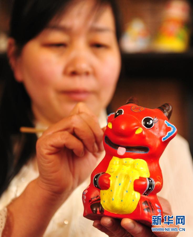 2月10日,在“三痴斋”泥塑大院,泥塑工作室艺人给“萌牛”泥塑作品进行绘彩。