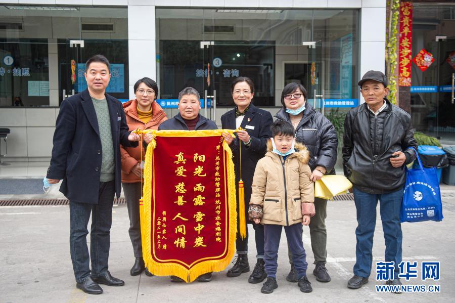 2月10日,在杭州市救助管理站,胡明仙一家人向杭州市救助管理站送上锦旗并与站长俞珍(左四)、工作人员左伟(左一)一起合影。新华社发(江汉摄)
