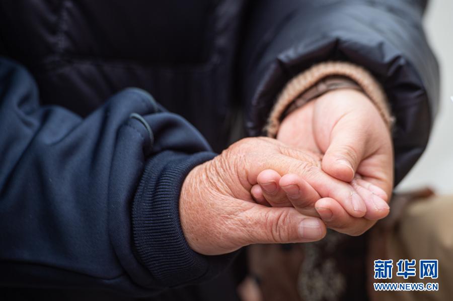 2月10日,在杭州市救助管理站,史玉霞抓着母亲的手。新华社发(江汉摄)