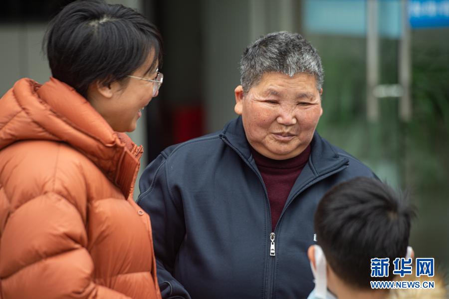 2月10日,在杭州市救助管理站,胡明仙(右)仔细端详自己素未谋面的外孙。新华社发(江汉摄)