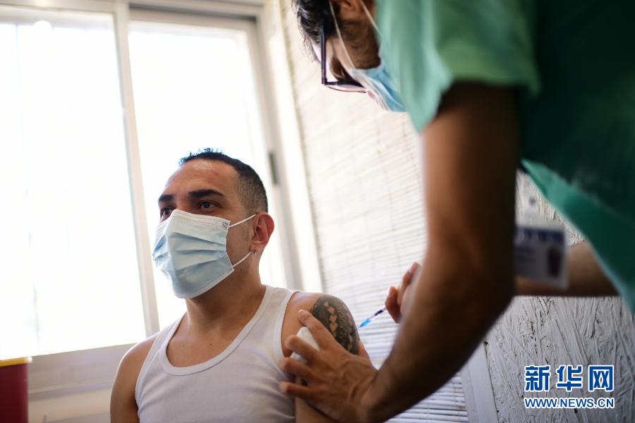 2月9日,在以色列特拉维夫苏拉斯基医疗中心,一名男子接种新冠疫苗。新华社/基尼图片社