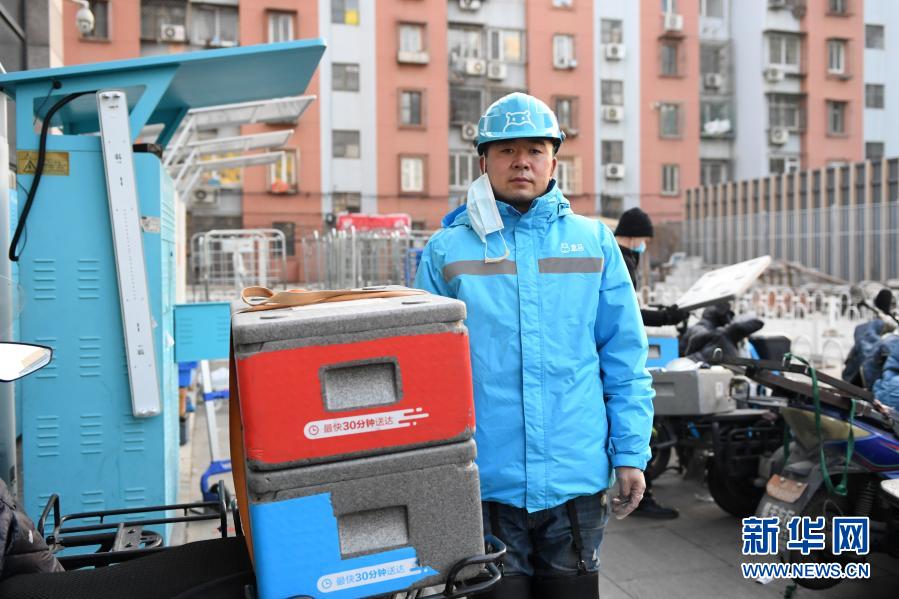 盒马鲜生枣园店配送员刘树才在出发配送前(2月5日摄)。刘树才,41岁,来自黑龙江省五常市,来到北京已经有10年。2020年3月,刘树才加入盒马鲜生成为一名配送员,负责门店附近3公里以内的货物配送,日均配送约60单。今年过年,他选择和妻子孩子一起留在北京过年,“老家七十多岁的父母都很支持我的工作,今年过年不能回家,我寻思跟爸妈说一句,让他俩在家别舍不得花钱,多买点好吃的。”刘树才说。