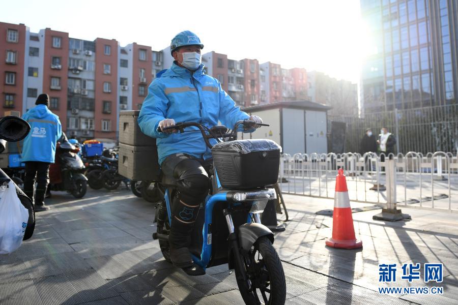 盒马鲜生枣园店配送员刘树才出发配送(2月5日摄)。刘树才,41岁,来自黑龙江省五常市,来到北京已经有10年。2020年3月,刘树才加入盒马鲜生成为一名配送员,负责门店附近3公里以内的货物配送,日均配送约60单。今年过年,他选择和妻子孩子一起留在北京过年,“老家七十多岁的父母都很支持我的工作,今年过年不能回家,我寻思跟爸妈说一句,让他俩在家别舍不得花钱,多买点好吃的。”刘树才说。
