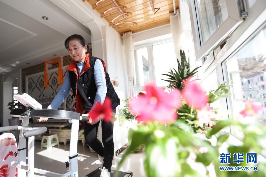 2月5日,在青海省海东市平安区三合镇的易地搬迁集中安置区,翻身村村民牟落毛吉在家中的跑步机上锻炼身体。