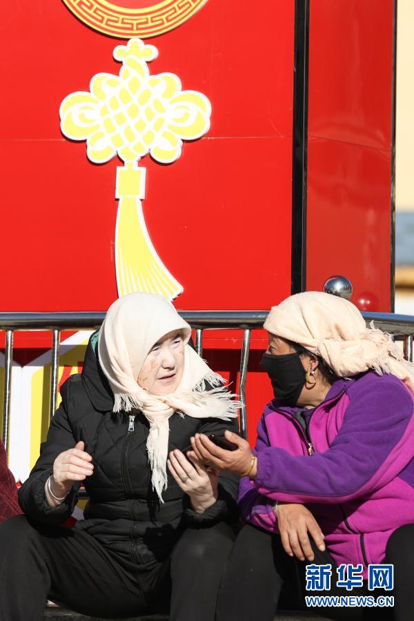 2月5日,在青海省海东市平安区三合镇的易地搬迁集中安置区,村民们在小区广场上聊天。