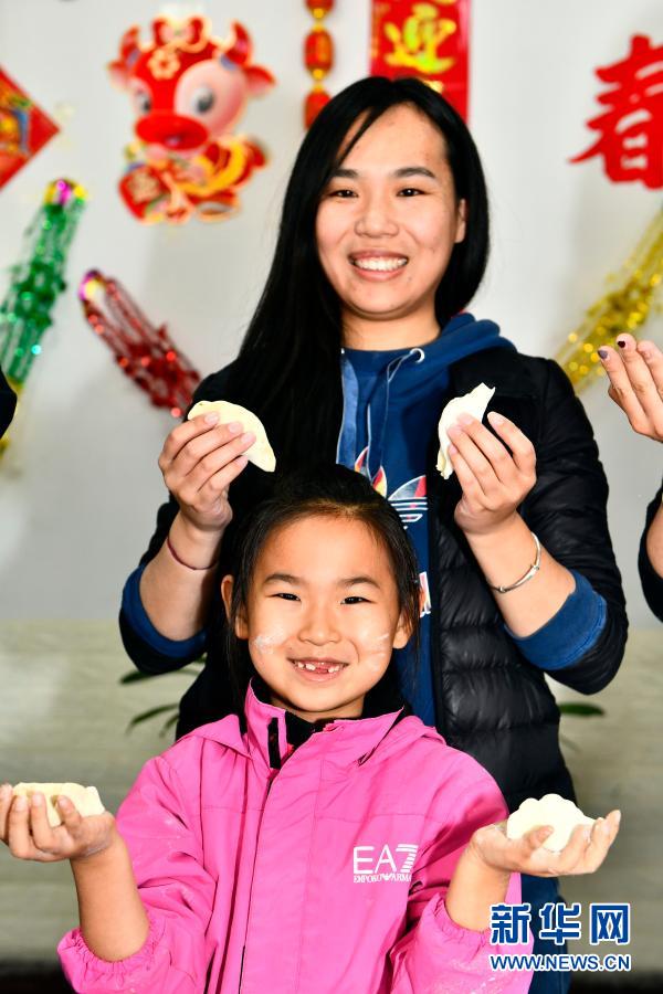 2月10日,在济(南)莱(芜)高铁中铁十局一工区,一名就地过年的职工和女儿在展示自己包的水饺。