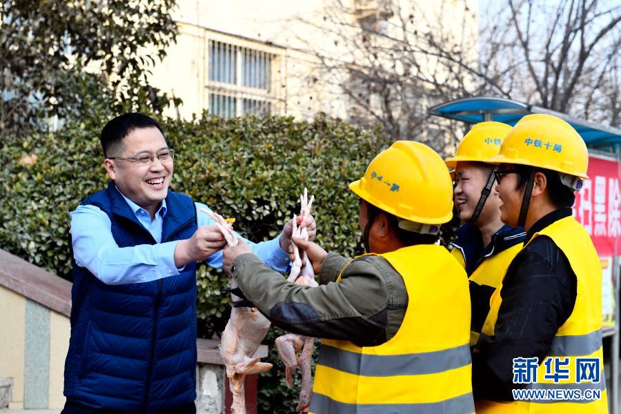 2月10日,在济(南)莱(芜)高铁中铁十局一工区,项目部工作人员为就地过年的外来务工人员送上慰问品。
