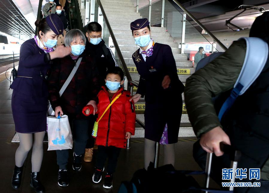 2月10日,G1347次高铁列车的乘务员在上海虹桥火车站协助旅客上车。