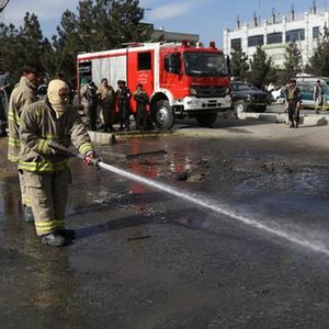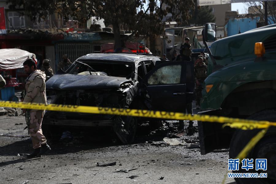 2月10日,安全人员在阿富汗首都喀布尔的汽车炸弹袭击现场执勤。