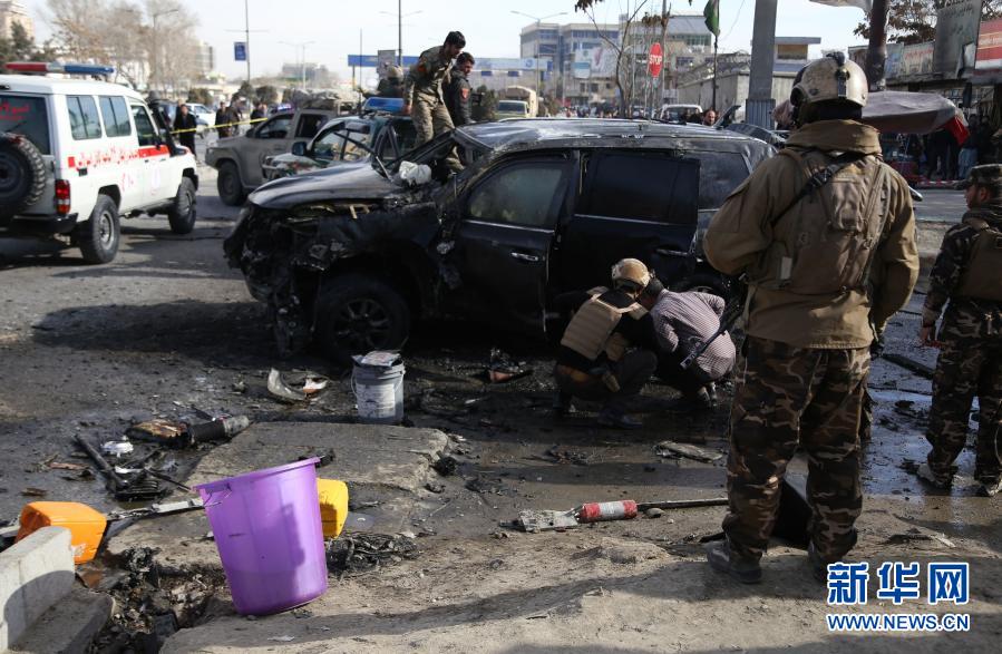 2月10日,安全人员在阿富汗首都喀布尔的汽车炸弹袭击现场检查。