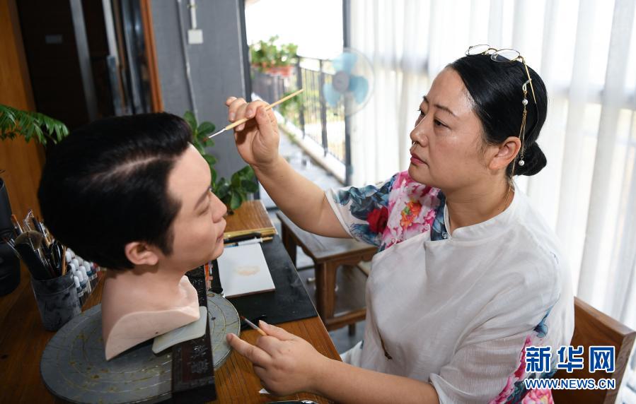 在大象东方蜡像艺术公司,创始人周雪蓉在给歌手李玉刚的蜡像头部上色(2月8日摄)。新华社记者 邓华 摄