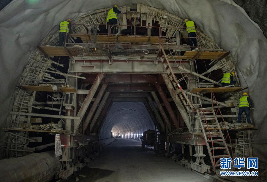 2月10日,在派墨公路老虎嘴隧道出口端,工作人员在进行二次衬砌施工。新华社记者 孙非 摄