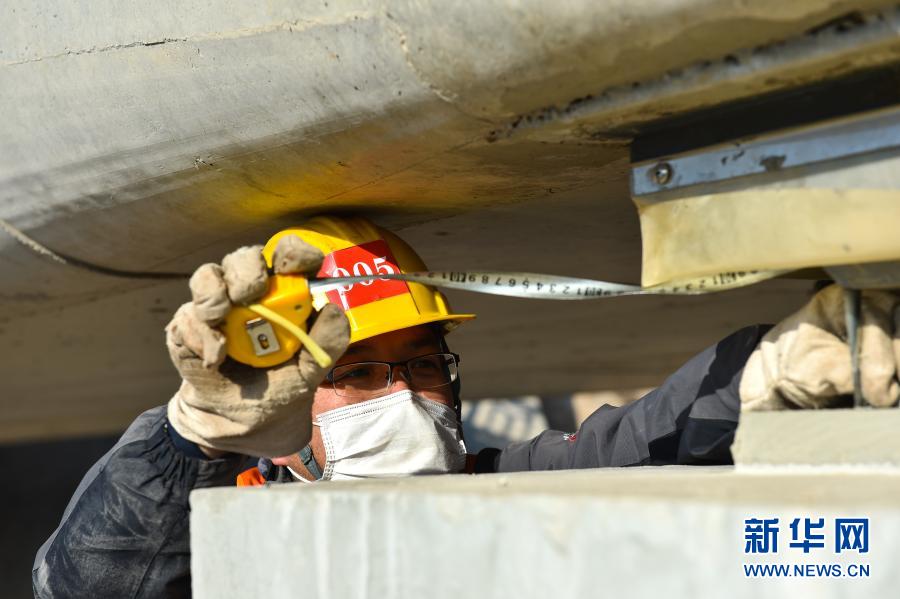 2月9日,在郑太高铁太焦段的白北村乌马河大桥,工人张秋生在检测四角高差。新华社记者 柴婷 摄