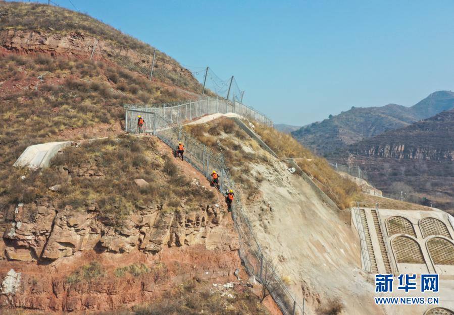 2月9日,在郑太高铁太焦段的太谷隧道附近,申源(左一)和工友沿山体攀爬(无人机照片)。新华社记者 柴婷 摄