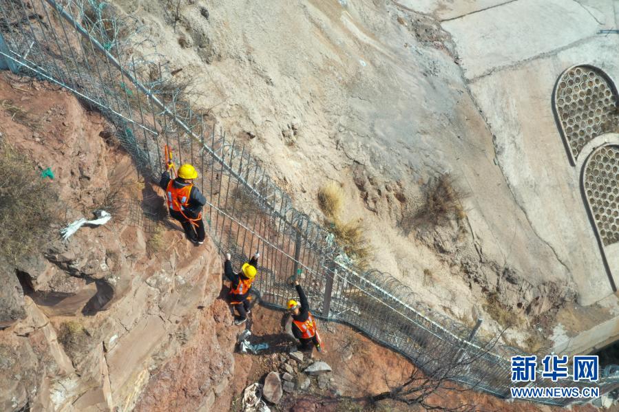 2月9日,在郑太高铁太焦段的太谷隧道附近,作业人员在攀爬过程中检查钢栅栏(无人机照片)。新华社记者 柴婷 摄