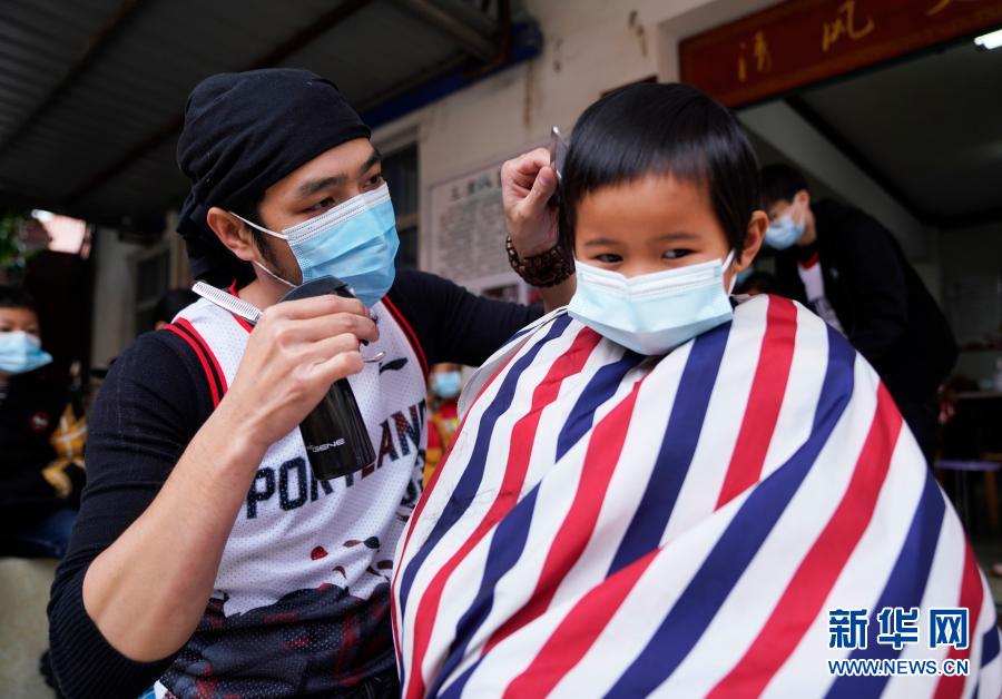 在南宁市江南区三津村,刘佳为小朋友理发(2月9日摄)。新华社记者 杨驰 摄