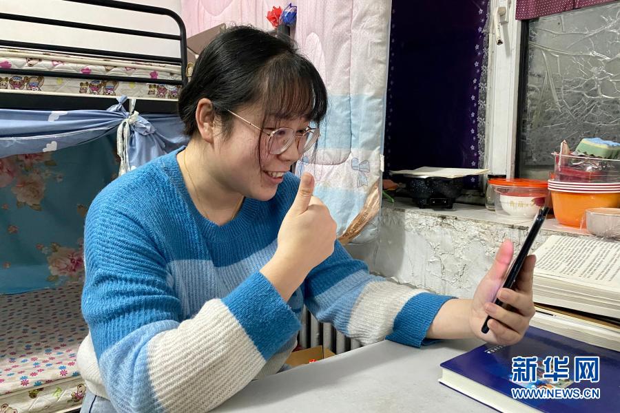 2月10日,在哈尔滨市平房区的宿舍里,刘雨晴在线上指导脑瘫儿童进行康复训练(手机照片)。