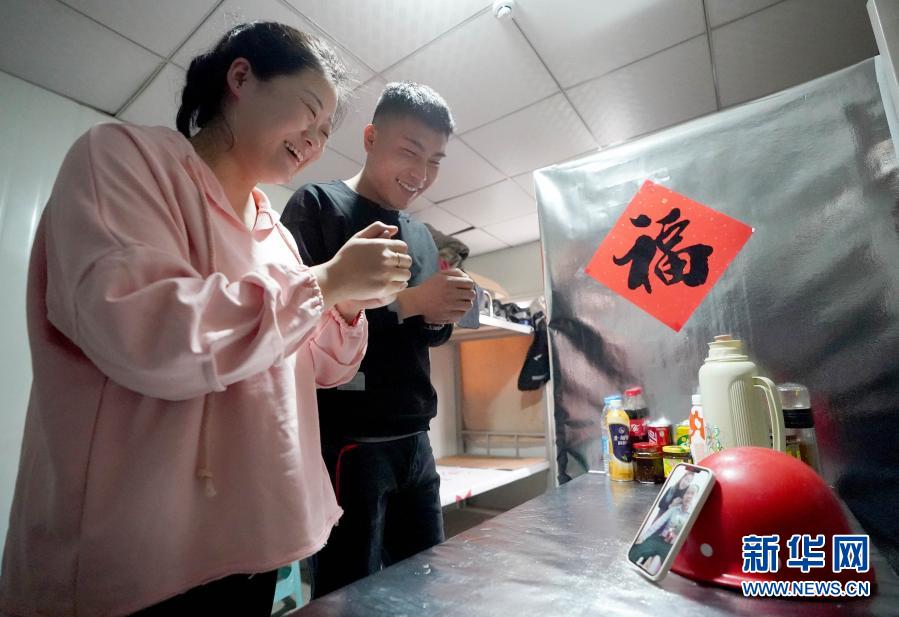 2月11日,来自吉林长春的北京丰台火车站改扩建工程施工管理人员杜岩、王一竹(左)夫妇在宿舍内通过手机视频给王一竹父母拜年。这是他俩第一次在北京过春节。