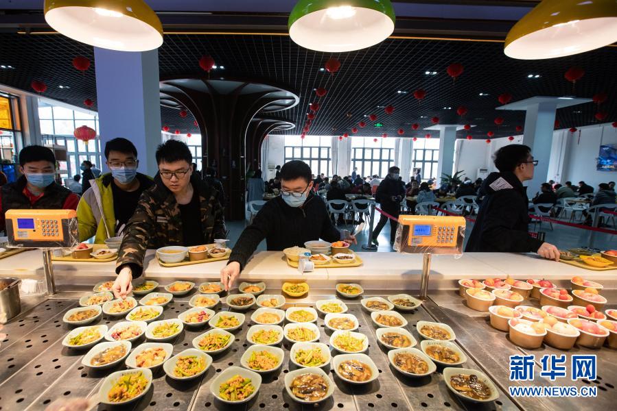 2月11日,在四川大学望江校区东二食堂,就餐的同学们排队取餐。
