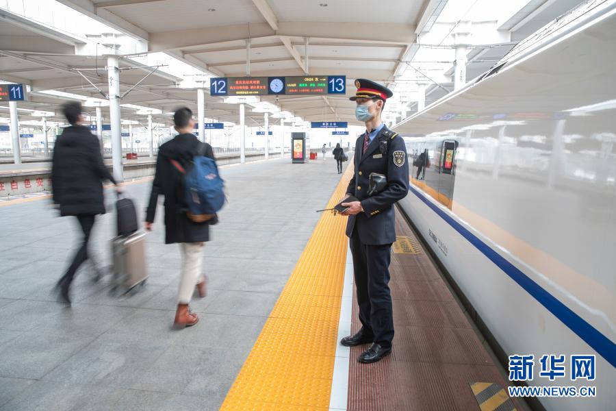 2月9日,付宝印在重庆北站站台迎接旅客。新华社记者 黄伟 摄