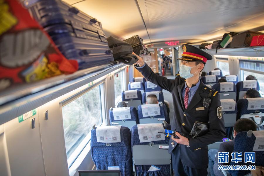 2月9日,在重庆北开往万州北的C6422次列车上,付宝印在巡视车厢时为旅客调整行李架上的行李。新华社记者 黄伟 摄