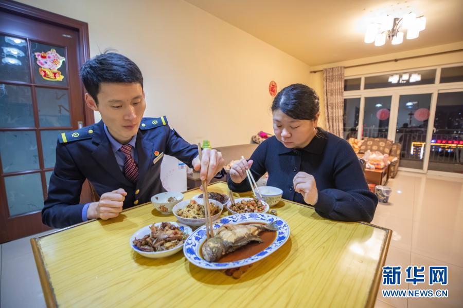 2月10日,付宝印与妻子孙梦洁在重庆市渝中区家中吃晚饭。新华社记者 黄伟 摄