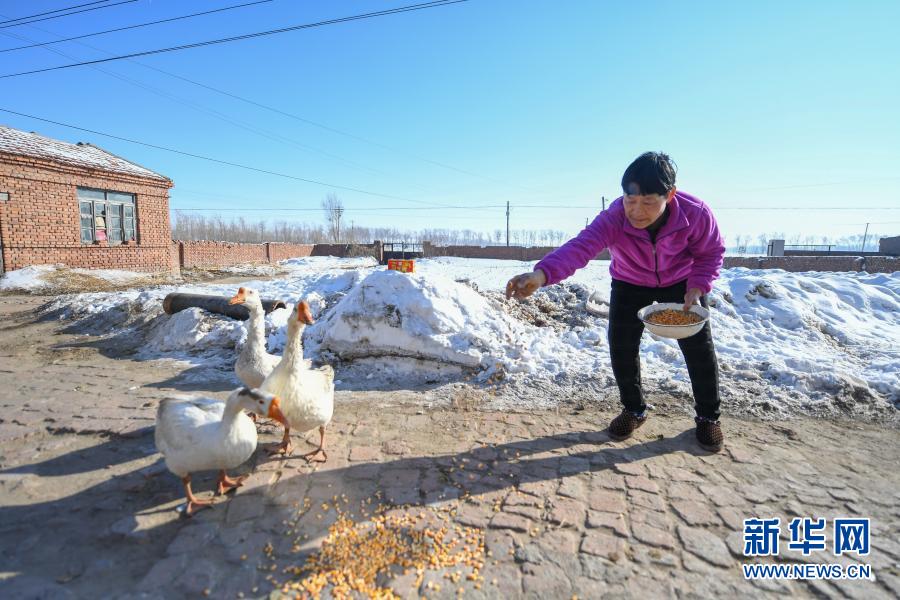 2月9日,在吉林省长春市农安县杨树林乡牛尾巴山村,付宝印的母亲钟士辉在喂鹅。新华社记者 张楠 摄