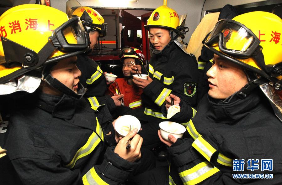 2月11日,上海市长宁区消防救援支队的消防员在值班消防车内吃饺子。当日是除夕,不少行业的工作人员依然坚守岗位,在工作中迎接春节的到来。新华社记者 陈飞 摄