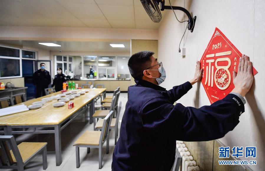 2月11日,在天津市公安局红桥分局芥园派出所,值班民警在年夜饭前贴“福”字布置餐厅。当日是除夕,不少行业的工作人员依然坚守岗位,在工作中迎接春节的到来。新华社发(孙凡越摄)