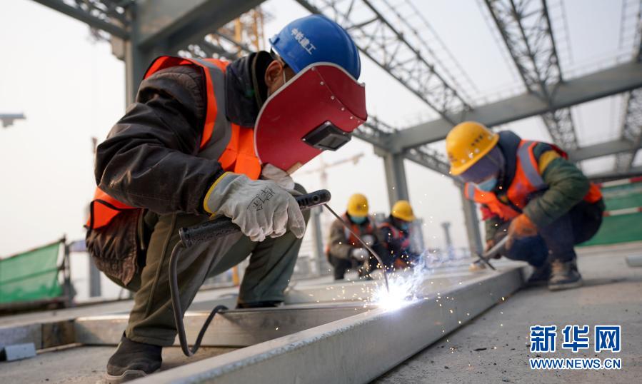 2月11日,北京丰台火车站改扩建工程的工人在进行焊接作业。