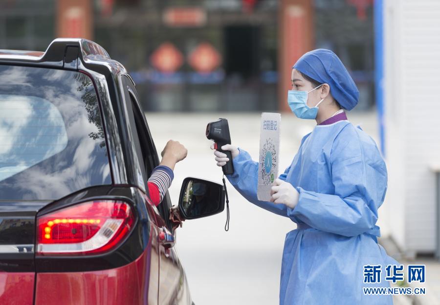 2月11日,在广西柳州市妇幼保健院,工作人员在医院入口处为市民测量体温。