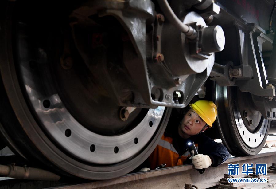 2月11日,在中国铁路郑州局集团有限公司郑州机务段,工作人员检查机车轮对。
