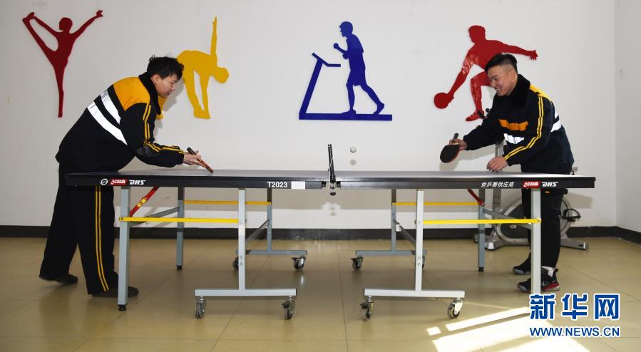 2月9日,中国铁路济南局集团有限公司济南车务段济南南站调车连结员徐玺栋(左)和刘腾在业余时间打乒乓球。