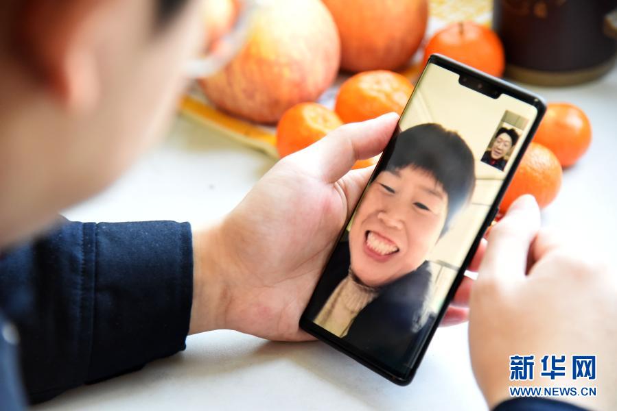 2月11日,中国铁路济南局集团有限公司济南车务段济南南站调车连结员刘泽在宿舍和母亲视频通话。今年24岁的刘泽是河北省武安市人,今年他主动申请留在站上过年。