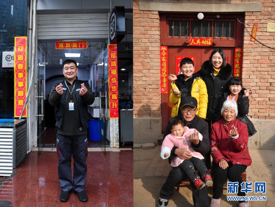 拼版照片:左图为2月10日,聂华辰在工作的顺丰速运深圳区福星营业部前比心(新华社记者 毛思倩 摄);右图为2月10日,聂华辰的父母妻儿在老家通许县四所楼镇真会村的家中比心(新华社记者 李嘉南 摄)。