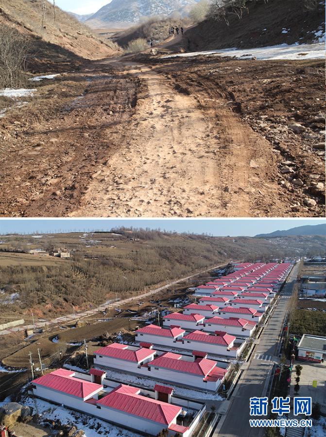 拼版照片:上图为2013年3月4日在渭源县元古堆村拍摄的乡道(新华社发 吴鲁摄);下图为2021年2月6日在渭源县元古堆村拍摄的乡村道路和易地扶贫搬迁点(新华社记者 马希平 摄)。新华社发