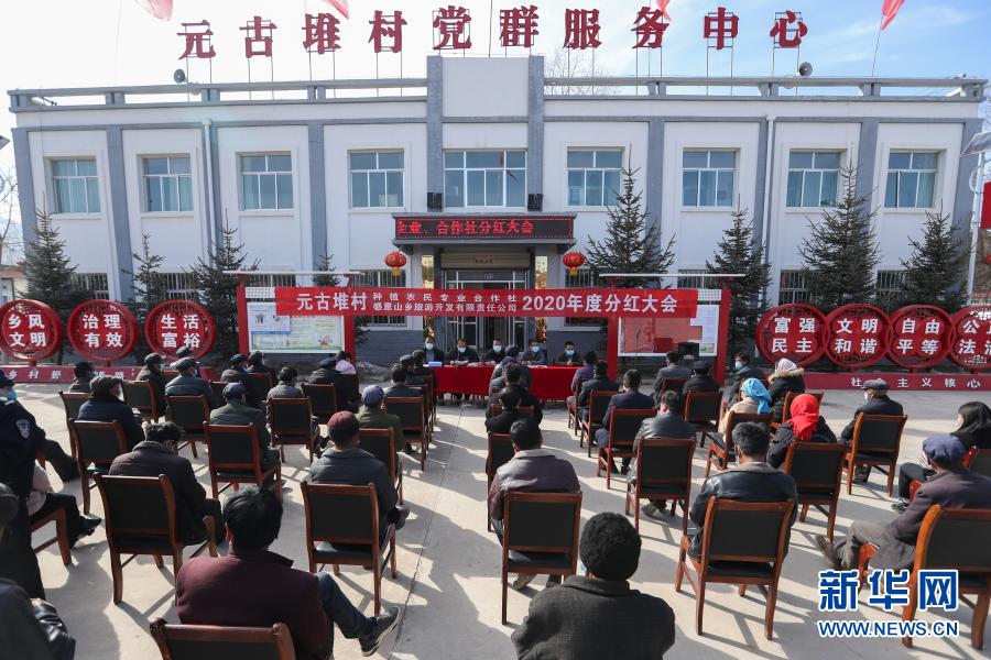 这是元古堆村2020年度分红大会现场(2月5日摄)。分红大会上,元古堆村种植农民专业合作社和元古堆村感恩山乡旅游开发有限责任公司向村民发放分红款。新华社记者 马希平 摄