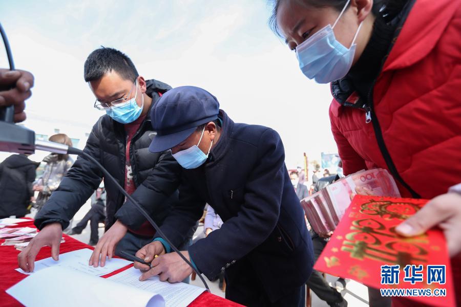 2月5日,在元古堆村文化广场,村民曾玉成(中)领取分红款。新华社记者 马希平 摄