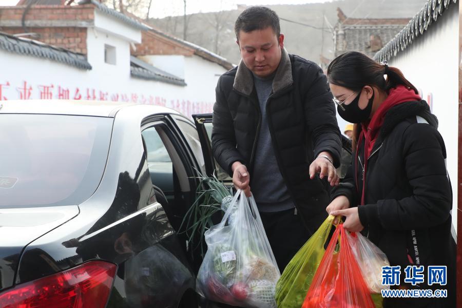 2月7日,元古堆村村民马海龙和妻子从车上取下置办的年货。新华社记者 马希平 摄